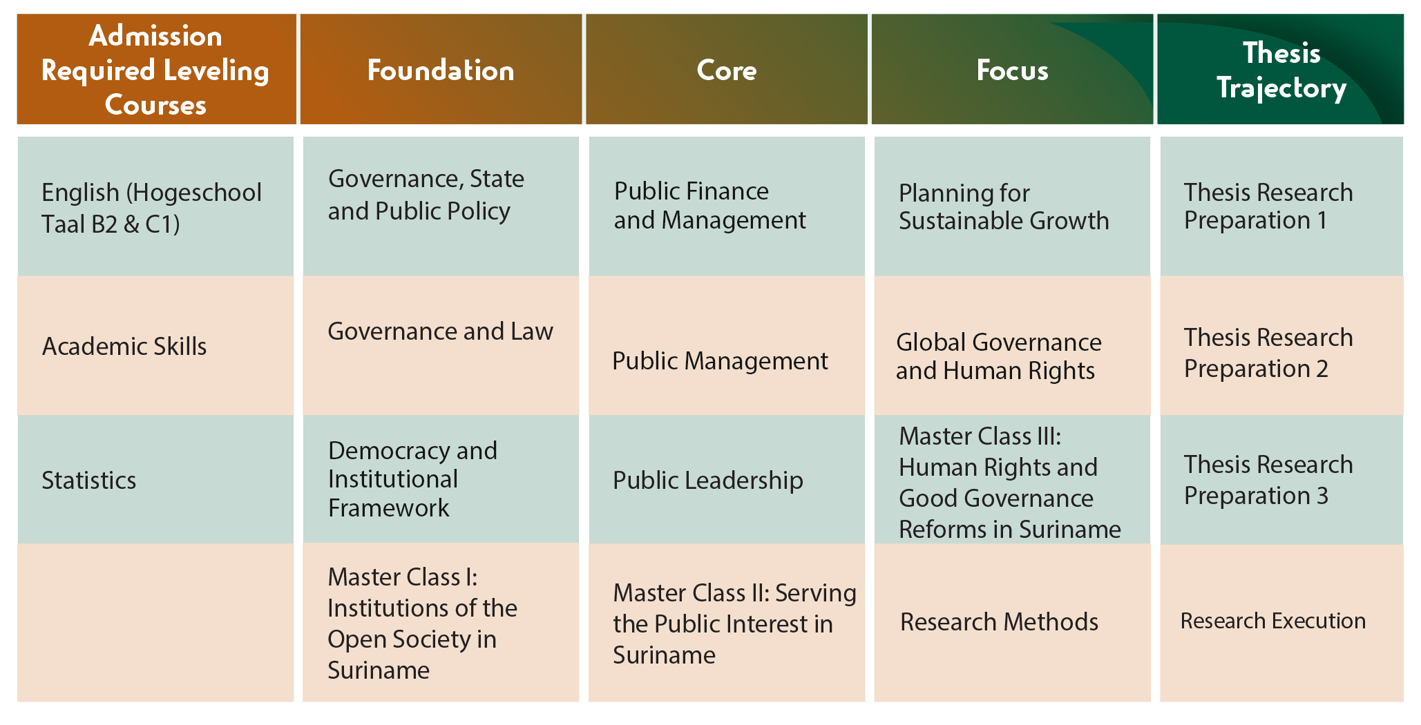 | Foundation | The foundation courses introduce participants to key concepts and approaches in the foundational disciplines of the study of governance: politics, economics, law and policy studies. Together, the five courses provide participants with a firm grounding to understand the origin and causes of governance problems in contemporary (developing) countries. | Democracy and Institutional Framework | 5 |