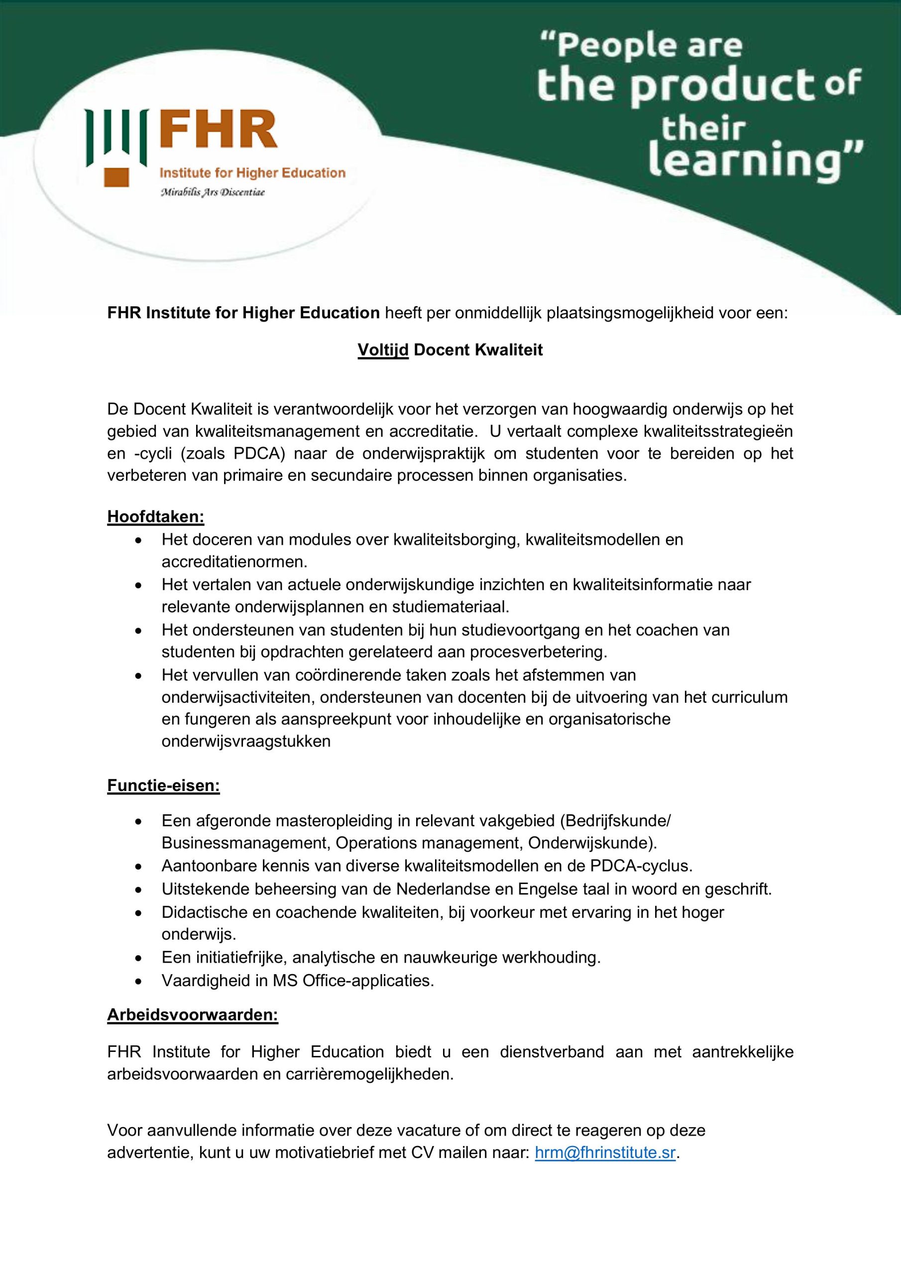Voor aanvullende informatie over deze vacature of om direct te reageren op deze advertentie, kunt u uw motivatiebrief met CV mailen naar: hrm@fhrinstitute.sr